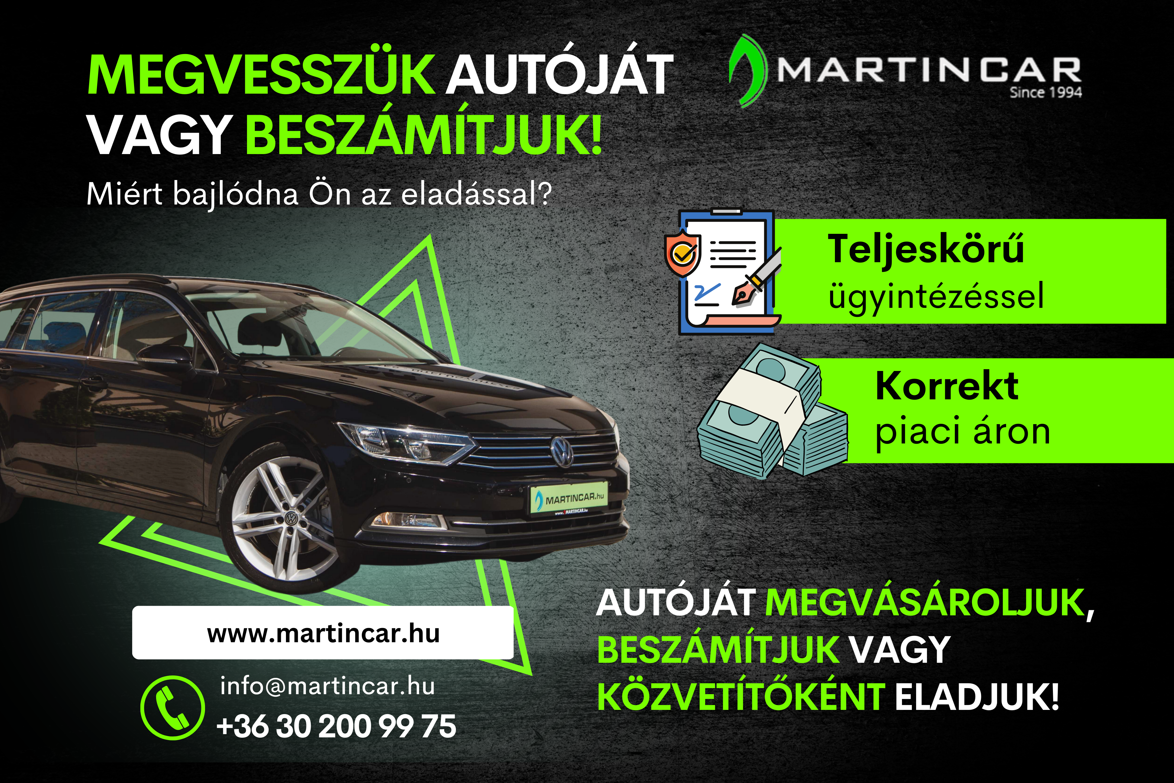 Értékesítőink elérhetősége: 06-30 2 644-644, 06-70 4 323-868, 06-30 200-99-75. AUTÓ, MOTORKERÉKPÁR, JET-SKI, HAJÓ, LAKÓKOCSI BESZÁMÍTÁS - CSERE KISEBB és NAGYOBB ÉRTÉKŰRE EGYARÁNT! Cégünk 2 telephelyen forgalmazza a gépjárműveket, így kérem, ha szükséges érdeklődjön telefonon, hogy megtekinteni kívánt autó melyiken található, valamint minden esetben érdeklődjön, hogy a gépjármű azonnal elvihető státuszban van e? Vagy esetlegesen némi ügyintézési időre van szükség az átadásához. A MartinCar létrehozta Debrecen és Hajdú Bihar legnagyobb kínálattal rendelkező használtautó kereskedését. Több mint 7500nm2 en, Európai színvonalon a város két frekventált pontján. Martin Car Autókereskedés alapítva 1994. Autóinkat Plusz 1-3 évig választható MŰSZAKI HASZNÁLTAUTÓ GARANCIÁVAL is megvásárolhatja! KEDVEZŐ, AKCIÓS FIX FORINTOS FINANSZÍROZÁS. GYORS TELJES KÖRŰ HITEL, BIZTOSÍTÁS, ÁTÍRÁS ÜGYINTÉZÉS. Telephelyünkön KÉSZPÉNZES AUTOFELVÁSÁRLÁS. HITELEL TERHELT AUTO ESETÉN is. Rossz idő esetén autóinkat zárt fűtött szervizben igényes körülmények között tekintheti meg! Nagyon köszönjük, hogy megtisztelte cégünket és megtekintette hirdetésünket. Bárminemű kérdés estén forduljon hozzánk bizalommal, 32 éves szakmai tapasztalattal segítjük Önt a legmegfelelőbb választásban! Minden e-mailre válaszolunk, az esetleges nem fogadott szám kijelzett hívásokat rövid időn belül visszahívjuk. Ajánlattételnek kizárólag az értékesítő kollégáink által írásban átadott és mind két fél részéről kölcsönösen elfogadott aláírt, ajánlat minősül! A gépjármű árának módosításának jogát fenntartjuk. Áraink készpénzfizetés és hitelre történő vásárlás esetén érvényesek. Átutalás esetén tranzakciós díj kerül felszámításra. A megvásárolt gépjárművek a komplex szolgáltatás keretein belül csak ügyintézőnk által megkötött KGFB biztosítással vihetők el! Ön 15 biztosító ajánlatait összevetve tudja kiválasztani az Önnek legkedvezőbbet. Kérjük, vegye figyelembe, hogy kereskedésünk kizárólag használt gépjárműveket forgalmaz, ennek tudatában vásárlás előtt mindenképp saját magának megnyugtató módon nézze át vagy vizsgáltassa át, ellenőriztesse a kiválasztott gépjárművet, hogy valóban megfelelő-e az Ön számára! A fényképek minden esetben a meghirdetett autókról készülnek, utólagosan retusálva nincsenek, de a leggondosabb bemutatás ellenére is, az autó valós műszaki, esztétikai állapota és felszereltsége mindenképp élőben ítélhető meg. Kereskedésünk nem Web áruház ezért kérjük, az élőben a helyszínen a megtekintett és kipróbált gépjárművet tekintse terméknek, adásvételre kizárólag telephelyünkön a gépjármű megtekintése, kipróbálása után kerülhet sor. Amennyiben nem biztos valamiben javasoljuk, vegye igénybe szakszerviz vagy más szak/hozzáértő cégünktől független személy segítségét. A hirdetés kitöltésekor esetlegesen adat vagy technikai leírás elgépelés előfordulhat. 3X- szoros kereskedői Garancia szavatolja Önnek, hogy a vásárolt gépkocsi km-óra állása valós, mely az adásvételi szerződésen is feltüntetésre kerül, szavatolja Önnek, hogy a gépjárművet valós eladótól veszi és az igény, per és terhelés mentes, így biztosan névre átírható. Minden általunk értékesített gépkocsit a hivatalos magyar jogszabályoknak megfelelően adunk át. Az autók kizárólag magyar eladótól magyar okmányokkal és magyar hivatalos adásvételi szerződéssel és cég esetén hivatalos számlával vehetők át. A hirdetet, gépkocsik tulajdonosai eltérnek, vagy saját, vagy bizományos és ezen belül lehet cég vagy magánszemély a tulajdonos. Erről vásárláskor minden esetben tájékoztatást nyújtunk. Autókereskedő cégeket törvény kötelezi arra, hogy az árukészletként kezelt magyar rendszámos gépkocsit kötelesek az értékesítés alatt kivonni a forgalomból. Rendszámmal még nem rendelkező, de már Magyarországon regisztrált gépjárművek esetén a rendszám és a végleges forgalmi engedély a jogi szabályzásnak megfelelően a hivatalos magyar adásvételi alapján a vásárló nevére kerül kiváltásra, kitöltésre. Ennek a díja nincs benne gépkocsi meghirdetett vételárában. Ezeket a díjakat mindenkor a Magyar államnak kell megfizetni átírási költségek címén. Átírási költségek magyar rendszámos gépkocsi esetén is fizetendők az állam felé. Ezen nem cégünk felé fizetendő költségek pontos előre történő számításában ügyintéző kollégáink rendelkezésre állnak. Lehetőség van kényelmi szolgáltatás keretében külön teljes körű gépjármű ügyintézés megrendelésére is.